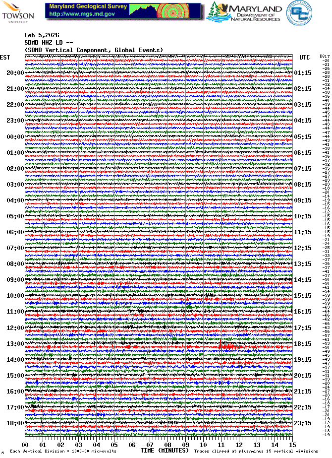 • Local:  Small, close-by seismic events. Locally generated seismic signals tend to be higher frequency and lower amplitude than large, distant events.  There is more noise in the local display due to traffic, wind, etc.