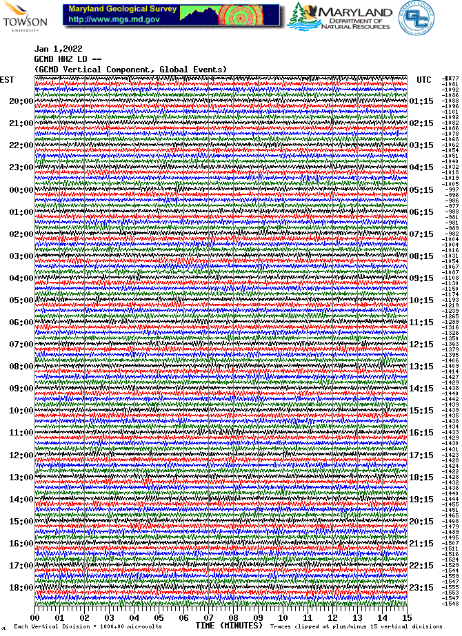 • Local:  Small, close-by seismic events. Locally generated seismic signals tend to be higher frequency and lower amplitude than large, distant events.  There is more noise in the local display due to traffic, wind, etc.