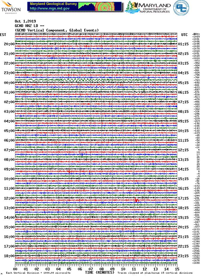• Local:  Small, close-by seismic events. Locally generated seismic signals tend to be higher frequency and lower amplitude than large, distant events.  There is more noise in the local display due to traffic, wind, etc.