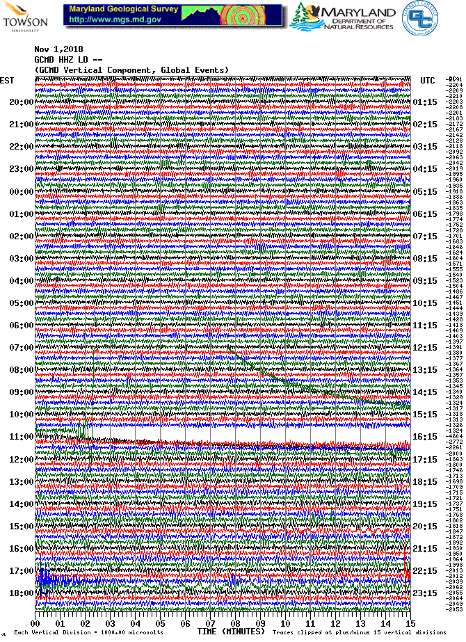 • Local:  Small, close-by seismic events. Locally generated seismic signals tend to be higher frequency and lower amplitude than large, distant events.  There is more noise in the local display due to traffic, wind, etc.