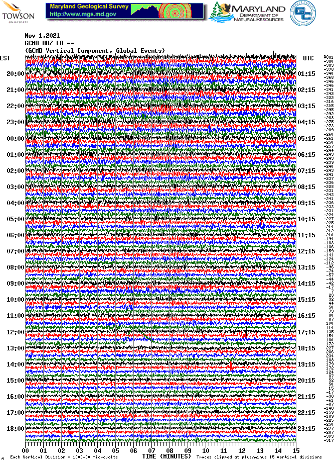 • Local:  Small, close-by seismic events. Locally generated seismic signals tend to be higher frequency and lower amplitude than large, distant events.  There is more noise in the local display due to traffic, wind, etc.