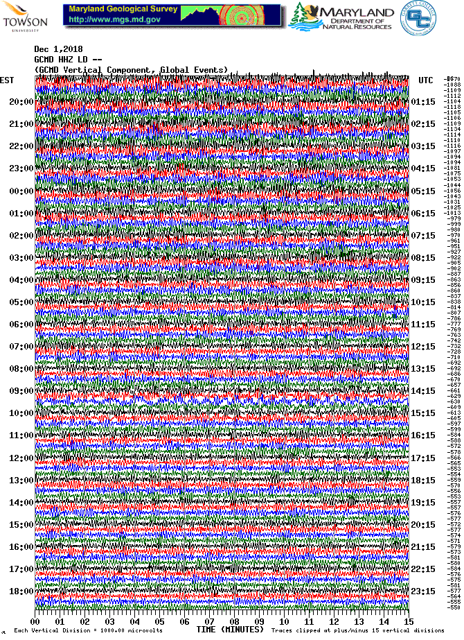 • Local:  Small, close-by seismic events. Locally generated seismic signals tend to be higher frequency and lower amplitude than large, distant events.  There is more noise in the local display due to traffic, wind, etc.