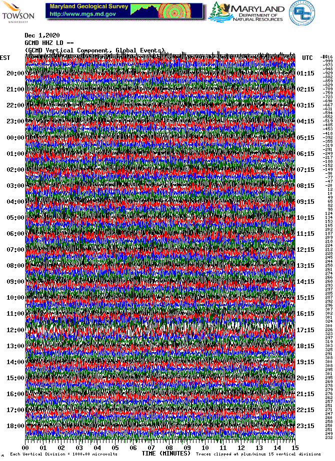 • Local:  Small, close-by seismic events. Locally generated seismic signals tend to be higher frequency and lower amplitude than large, distant events.  There is more noise in the local display due to traffic, wind, etc.