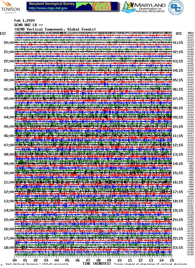 • Local:  Small, close-by seismic events. Locally generated seismic signals tend to be higher frequency and lower amplitude than large, distant events.  There is more noise in the local display due to traffic, wind, etc.