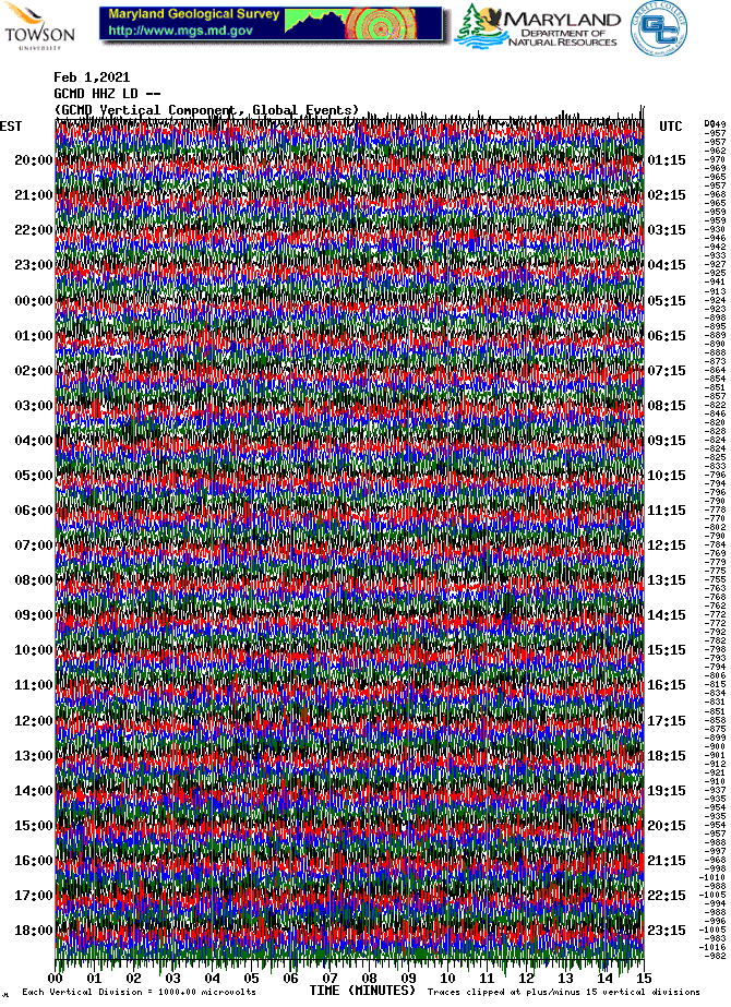 • Local:  Small, close-by seismic events. Locally generated seismic signals tend to be higher frequency and lower amplitude than large, distant events.  There is more noise in the local display due to traffic, wind, etc.