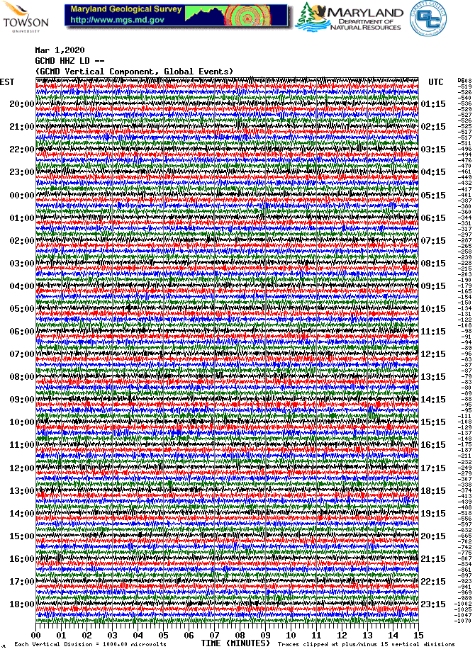 • Local:  Small, close-by seismic events. Locally generated seismic signals tend to be higher frequency and lower amplitude than large, distant events.  There is more noise in the local display due to traffic, wind, etc.