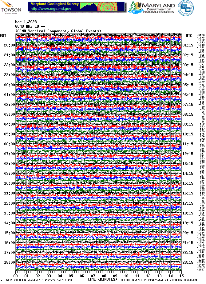 • Local:  Small, close-by seismic events. Locally generated seismic signals tend to be higher frequency and lower amplitude than large, distant events.  There is more noise in the local display due to traffic, wind, etc.