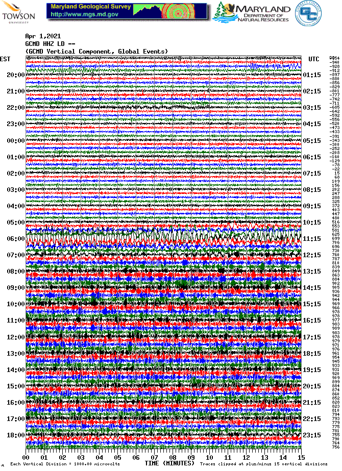 • Local:  Small, close-by seismic events. Locally generated seismic signals tend to be higher frequency and lower amplitude than large, distant events.  There is more noise in the local display due to traffic, wind, etc.