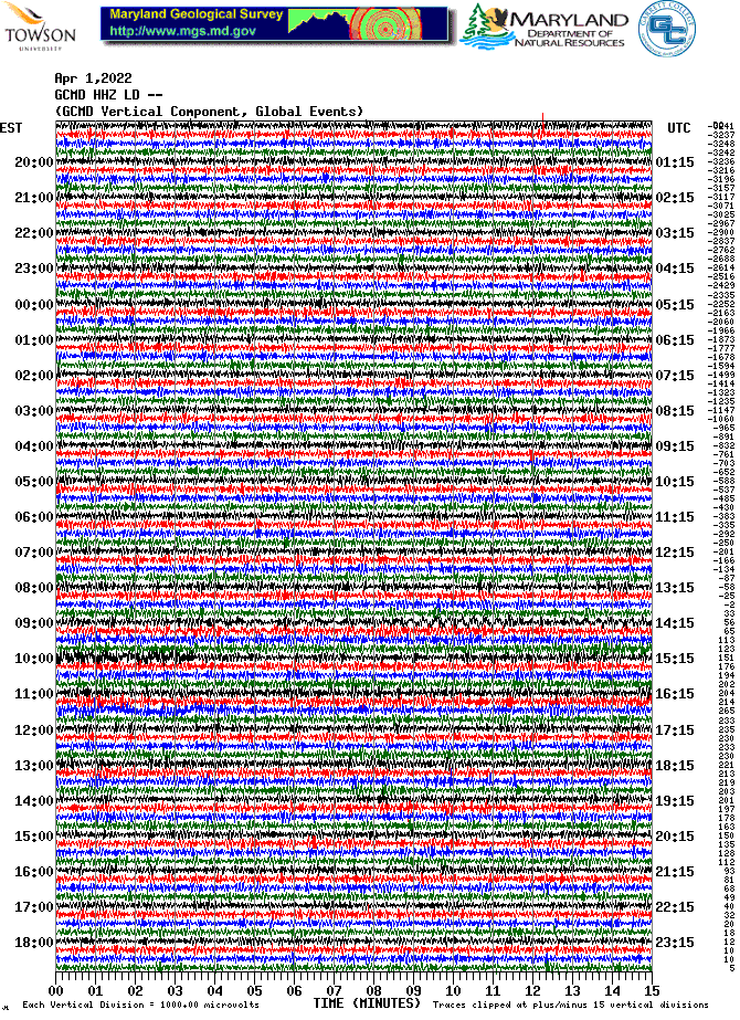 • Local:  Small, close-by seismic events. Locally generated seismic signals tend to be higher frequency and lower amplitude than large, distant events.  There is more noise in the local display due to traffic, wind, etc.