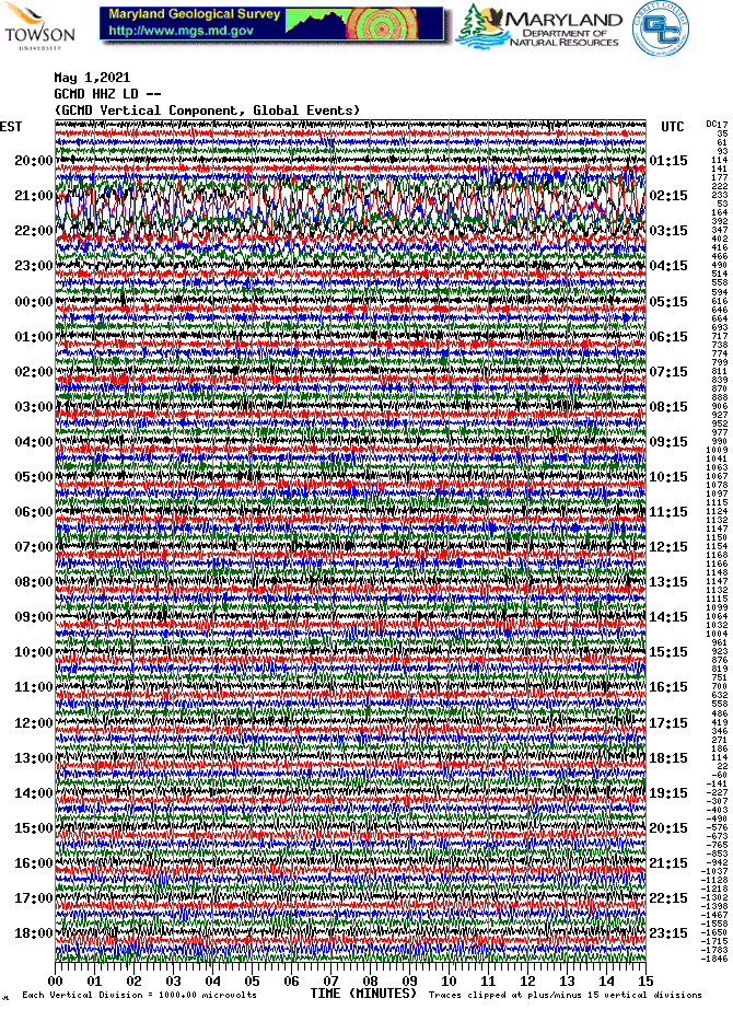 • Local:  Small, close-by seismic events. Locally generated seismic signals tend to be higher frequency and lower amplitude than large, distant events.  There is more noise in the local display due to traffic, wind, etc.