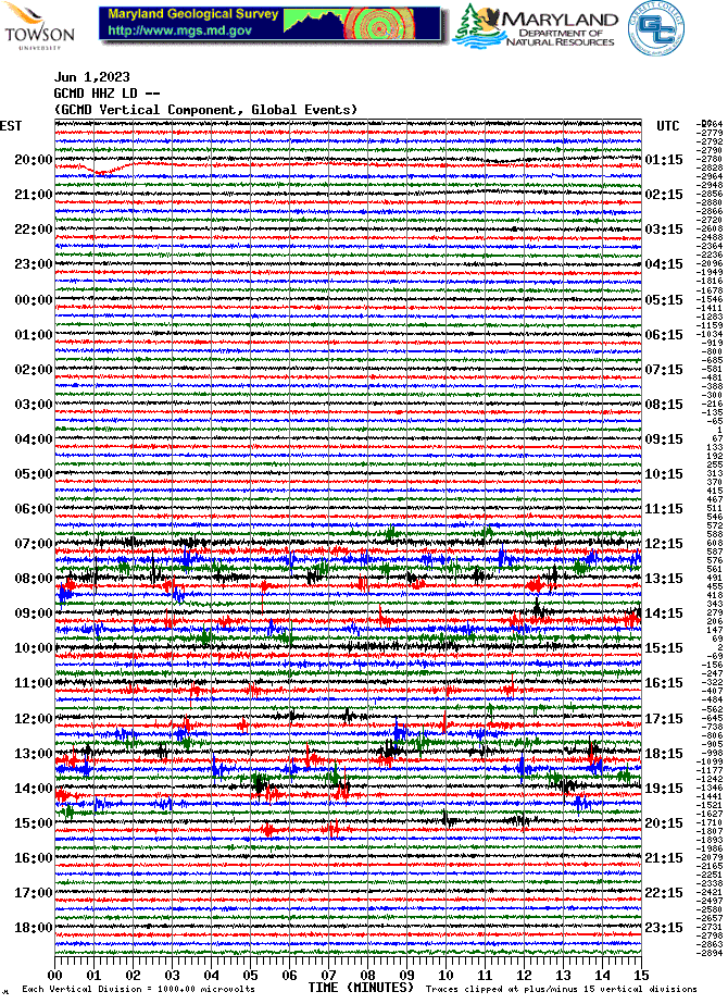 • Local:  Small, close-by seismic events. Locally generated seismic signals tend to be higher frequency and lower amplitude than large, distant events.  There is more noise in the local display due to traffic, wind, etc.
