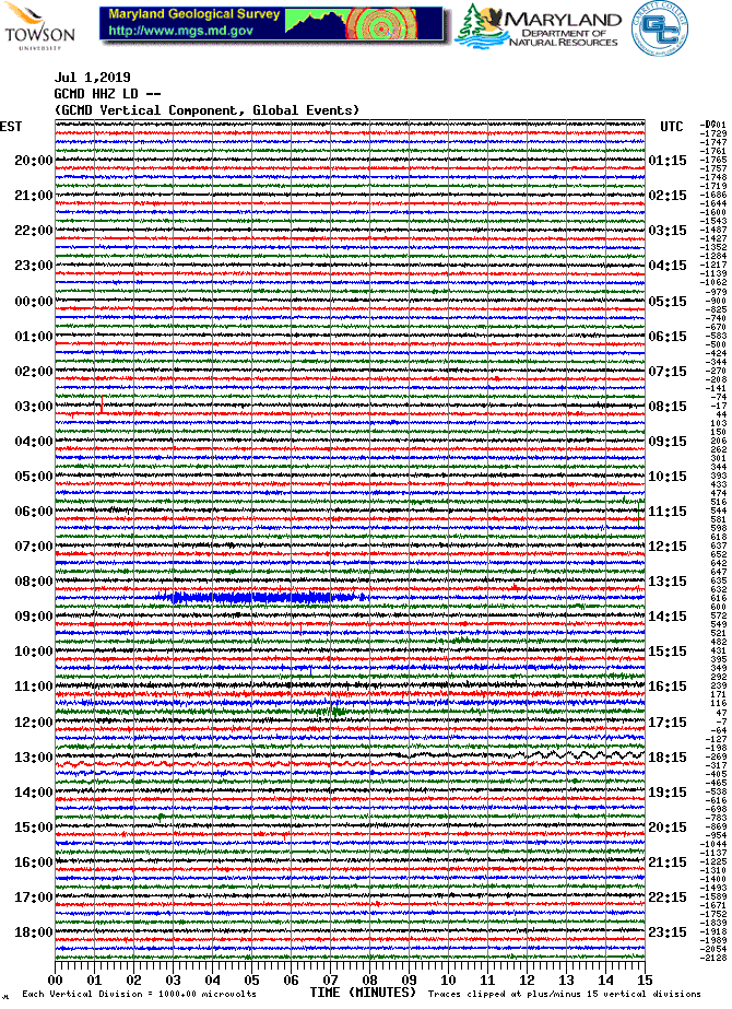 • Local:  Small, close-by seismic events. Locally generated seismic signals tend to be higher frequency and lower amplitude than large, distant events.  There is more noise in the local display due to traffic, wind, etc.