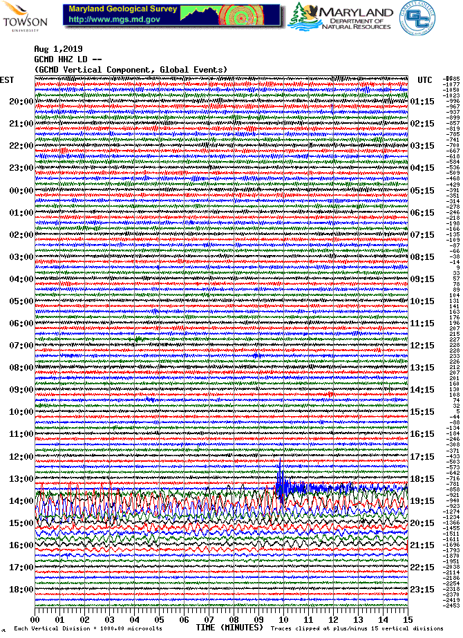 • Local:  Small, close-by seismic events. Locally generated seismic signals tend to be higher frequency and lower amplitude than large, distant events.  There is more noise in the local display due to traffic, wind, etc.