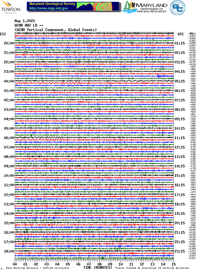 • Local:  Small, close-by seismic events. Locally generated seismic signals tend to be higher frequency and lower amplitude than large, distant events.  There is more noise in the local display due to traffic, wind, etc.