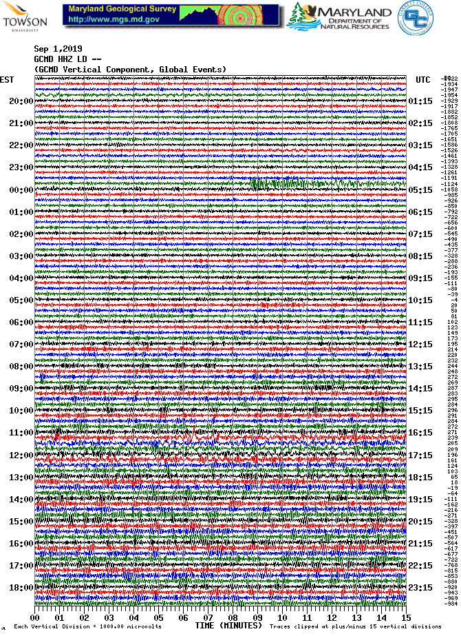 • Local:  Small, close-by seismic events. Locally generated seismic signals tend to be higher frequency and lower amplitude than large, distant events.  There is more noise in the local display due to traffic, wind, etc.