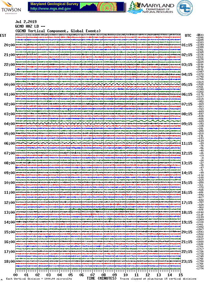 • Local:  Small, close-by seismic events. Locally generated seismic signals tend to be higher frequency and lower amplitude than large, distant events.  There is more noise in the local display due to traffic, wind, etc.