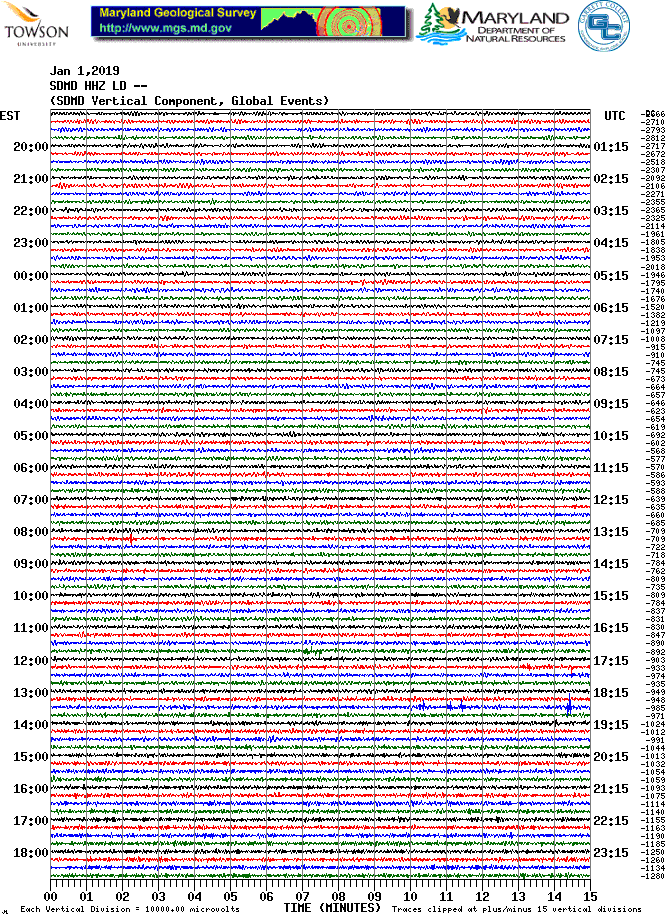 • Local:  Small, close-by seismic events. Locally generated seismic signals tend to be higher frequency and lower amplitude than large, distant events.  There is more noise in the local display due to traffic, wind, etc.