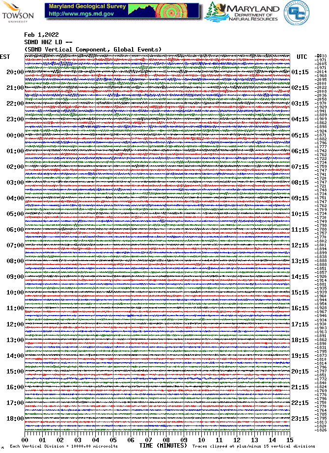 • Local:  Small, close-by seismic events. Locally generated seismic signals tend to be higher frequency and lower amplitude than large, distant events.  There is more noise in the local display due to traffic, wind, etc.