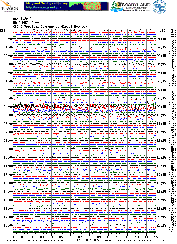 • Local:  Small, close-by seismic events. Locally generated seismic signals tend to be higher frequency and lower amplitude than large, distant events.  There is more noise in the local display due to traffic, wind, etc.