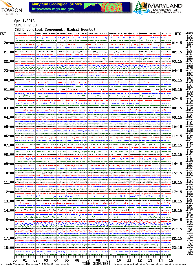 • Local:  Small, close-by seismic events. Locally generated seismic signals tend to be higher frequency and lower amplitude than large, distant events.  There is more noise in the local display due to traffic, wind, etc.