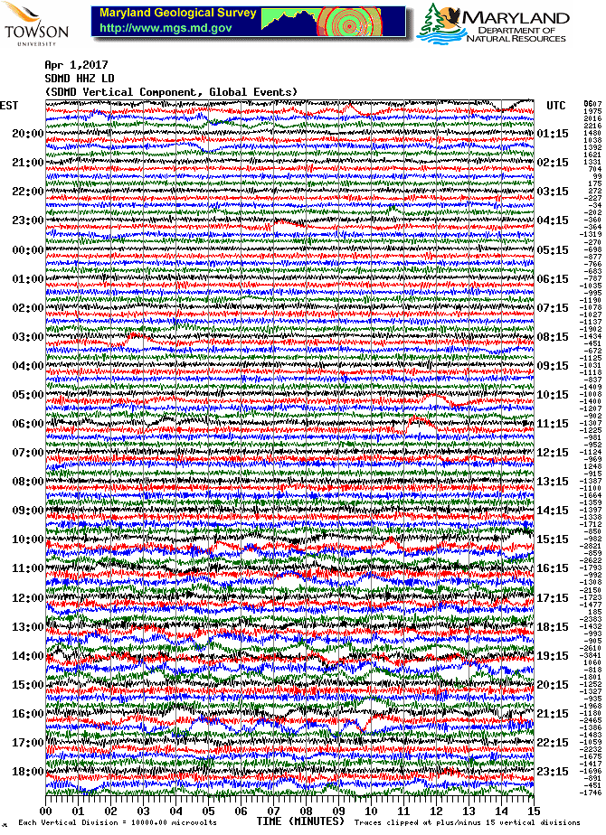 • Local:  Small, close-by seismic events. Locally generated seismic signals tend to be higher frequency and lower amplitude than large, distant events.  There is more noise in the local display due to traffic, wind, etc.