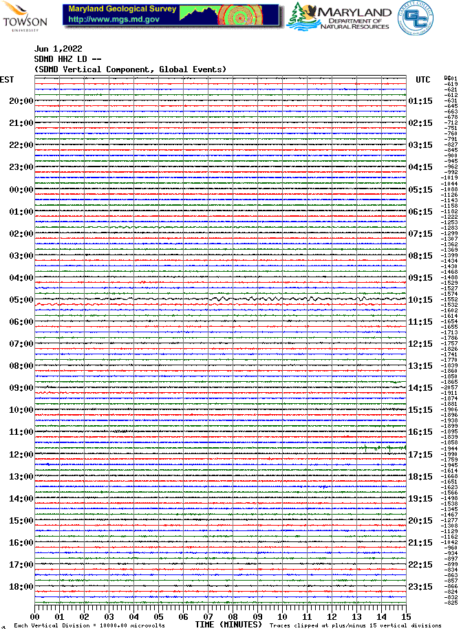 • Local:  Small, close-by seismic events. Locally generated seismic signals tend to be higher frequency and lower amplitude than large, distant events.  There is more noise in the local display due to traffic, wind, etc.