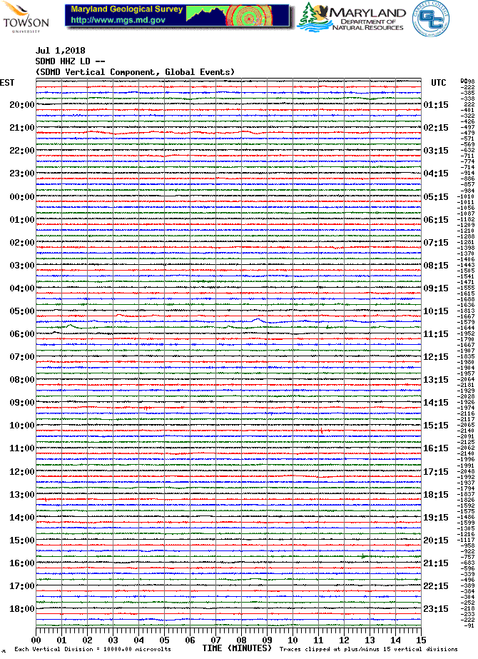 • Local:  Small, close-by seismic events. Locally generated seismic signals tend to be higher frequency and lower amplitude than large, distant events.  There is more noise in the local display due to traffic, wind, etc.