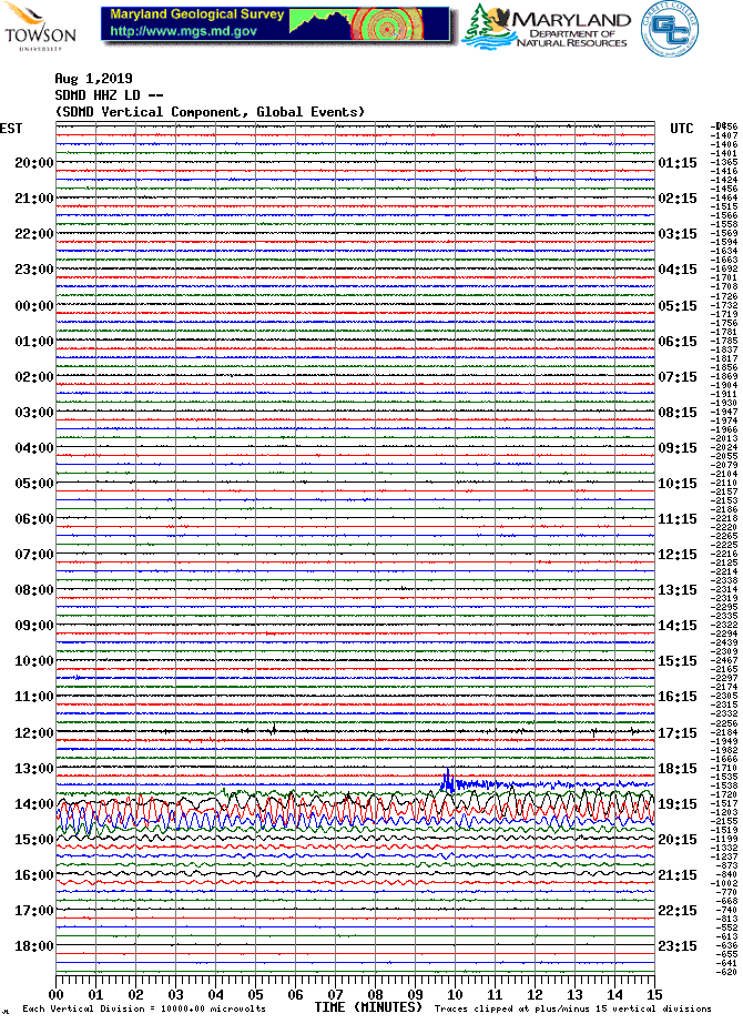 • Local:  Small, close-by seismic events. Locally generated seismic signals tend to be higher frequency and lower amplitude than large, distant events.  There is more noise in the local display due to traffic, wind, etc.