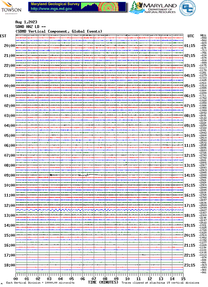 • Local:  Small, close-by seismic events. Locally generated seismic signals tend to be higher frequency and lower amplitude than large, distant events.  There is more noise in the local display due to traffic, wind, etc.