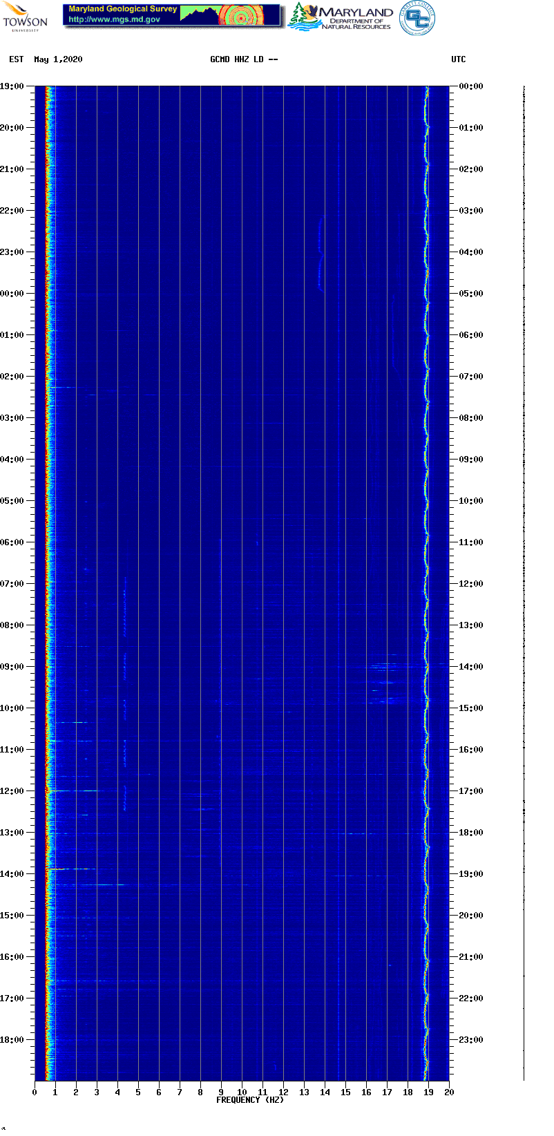 • Local:  Small, close-by seismic events. Locally generated seismic signals tend to be higher frequency and lower amplitude than large, distant events.  There is more noise in the local display due to traffic, wind, etc.